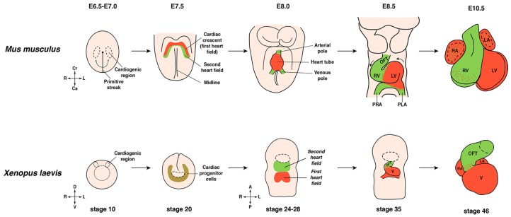 Figure 1. Early cardiogenesis in mouse (upper panel) and Xenopus (lower panel). During gastrulation myocardial progenitor cells arise from the mesoderm and migrate to the ventral midline to the anterior part of the embryo. The progenitor cells form the cardiac crescent (first heart field), which already includes differentiated cardiomyocytes. The primary heart tube is formed at the ventral midline, starts to beat and undergoes looping and further morphological remodeling. Subsequently, the different cardiac chambers are formed. Cr-Ca/D-V/A-P and R-L axes are indicated. A: anterior; Ca, caudal; Cr: cranial; D: dorsal; L: left; LA: left atrium; LV: left ventricle; OFT: outflow tract; PLA: primitive left atrium; P: posterior; PRA: primitive right atrium; R: right; RA: right atrium; RV: right ventricle; V: ventral. |