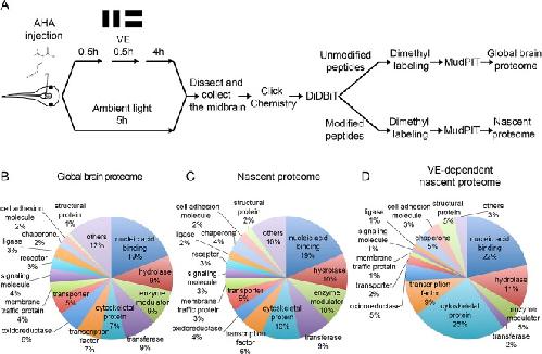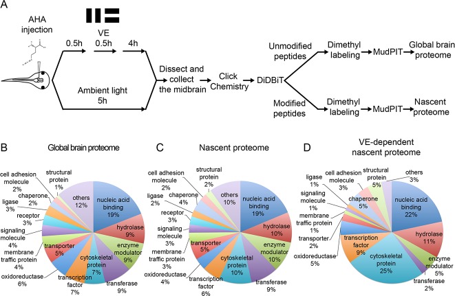 Figure 1. Quantitative MS/MS analysis of newly synthesized proteins in vivo identifies visual experience-induced dynamics in the nascent proteome.(A) Protocol to prepare AHA-labeled samples from animals with or without visual experience (VE) for quantitative proteomic analysis. The midbrain ventricle was injected with AHA before exposure to a moving bar stimulus for 0.5 hr followed by 4 hr in ambient light. Control animals were exposed to ambient light for 5 hr. We dissected midbrains from 1200 to 1500 stage 47/48 tadpoles for each experimental group, yielding about 15 mg protein, in two independent experiments. Newly synthesized proteins (NSPs) from midbrains were tagged with biotin using click chemistry and processed for direct detection of biotin tags (DiDBiT). Samples from control and VE-treated animals were combined after dimethyl labeling for multidimensional protein identification technology (MudPIT) analysis. We identified 83 candidate plasticity proteins (CPPs) in the VE-dependent nascent proteome. (B–D) Pie charts of the protein classes in the global brain proteome (B), nascent proteome (C), and VE-dependent nascent proteome (D). Proteins were annotated using PANTHER protein classes. |