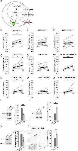 Figure 5. Newly synthesized eIF3A and RPS17 are required for visual experience-dependent structural plasticity.(A) Schematic of different steps of regulation in gene and protein expression. (BâDââ) VE-dependent changes in tectal neuron dendritic arbor growth rate over 4 hr in dark and VE in tecta electroporated with control MO (B, C, D), designated CPP MOs (Bâ, Bââ, Câ, Dâ), or CPP MOs and rescue constructs (Cââ, Dââ). Gray lines connect data points for individual neurons and black lines are average changes in TDBL in dark and VE. (BâBâ) VE-dependent changes in growth rate in tecta treated with control MO (B, eIF3A MO (Bâ), or RPS17 MO (Bââ). Control MO: n = 22 cells; eIF3A MO: n = 17 cells; RPS17 MO: n = 10 cells. Both eIF3A MO and RPS17 MO blocked the VE-dependent increase in dendritic arbor growth rate observed in controls. (CâCââ) Co-expression of eIF3A MO and exogenous eIF3A rescued the deficit in VE-induced structural plasticity seen with eIF3A knockdown. Control MO: n = 10 cells; eIF3A MO: n = 14 cells; eIF3A MO + eIF3A: n = 7 cells. (DâDââ) Co-expression of RPS17 MO and exogenous RPS17 rescued the deficit in VE-induced dendritic structural plasticity seen with RPS17 knockdown. Control MO: n = 9 cells; RPS17 MO: n = 10 cells; RPS17 MO + RPS17: n = 9 cells. (EâH) Validation of eIF3A and RPS17 knockdown and OE. (E, F) Left: representative WB of eIF3A and β-tubulin from tecta electroporated with eIF3A MO (E) or MO-insensitive eIF3A expression construct (F) compared to controls. Right: eIF3A MO significantly decreased synthesis of eIF3A protein (eIF3A MO: 0.5 ± 0.05, p=0.0003; n = 5 independent experiments) and the eIF3A expression construct generated significantly more eIF3A protein (eIF3A-OE: 1.89 ± 0.18, p=0.0198; n = 3 independent experiments). (G) Left: WB of RPS17 and β-tubulin from tecta electroporated with control or RPS17 MO. Right: Normalized RPS17 expression levels in tecta electroporated with control or RPS17 MO. RPS17 MO significantly reduced synthesis of RPS17 protein (RPS17 MO: 0.54 ± 0.16, p=0.0309; n = 4 independent experiments). (H) Left: Images of GFP (top), RPS17 (middle) expression and DAPI (bottom) labeling in HEK cells expressing GFP alone (Control, left) or GFP and RPS17 (right). Right: RPS17 expression in GFP+ ROI, normalized to RPS17 expression in GFP- ROI. The RPS17 expression construct increased RPS17 immunolabeling. Control: 1.6 ± 0.16; RPS17-OE: 2.43 ± 0.19; p=0.0029; n = 7 different fields imaged from two independent experiments for each experimental condition. *p<0.05, **p<0.01, two-tailed paired Studentâs t test were used to compare between two matched pairs (BâD) and one-tailed Studentâs t test for comparisons of two independent groups (EâH). Error bars represent ±SEM (EâH).10.7554/eLife.33420.015Figure 5âsource data 1. Values of VE-dependent changes in tectal neuron growth rate over 4 hr in dark and VE presented in Figure 5BâBââ, Figure 5CâCââ, and Figure 5DâDââ.Raw values of normalized protein expression of eif3A or RPS17 in tecta electroporated with control/eif3A MO, control/eIF3A expression construct, or control/RPS17 MO presented in Figure 5EâG. Raw values of normalized protein expression of RPS17 in HEK cells transfected with control or RPS17 expression construct presented in Figure 5H. |