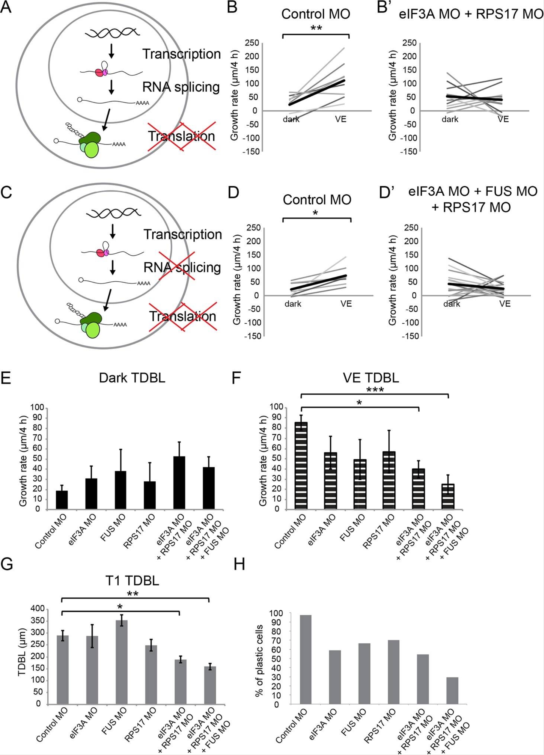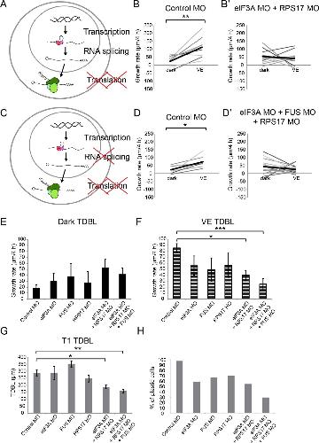 Figure 6. Knockdown of EIF3a, RPS17, and FUS blocks visual experience-dependent structural plasticity. (A, C) Schematics of different steps of regulation in gene and protein expression. We tested the effect of manipulating translation alone (A) or both translation and RNA splicing (C). (BâBâ, DâDâ) VE-dependent changes in growth rate over 4 hr in dark and VE in tecta treated with control MO (B, D) or designated CPP MO mixtures (Bâ, Dâ). Gray lines connect data points for individual neurons and black lines are average changes in growth rate in dark and VE. (B, Bâ) VE-dependent changes in growth rate in neurons from tecta electroporated with control MO (B) or eIF3A and RPS17 MO (Bâ). Control MO: n = 9 cells; eIF3A MO + RPS17 MO: n = 11 cells. Knocking down both eIF3A and RPS17 blocked the VE-dependent increase in dendritic arbor growth. (D, Dâ) VE-dependent changes in growth rate of neurons in tecta electroporated with control MO (D) or a mixture of eIF3A MO, RPS17 MO, and FUS MO (Dâ). Control MO: n = 7 cells; eIF3A MO + RPS17 MO + FUS MO: n = 17 cells. Combined knockdown of eIF3A, RPS17, and FUS blocked the VE-dependent increase in dendritic arbor growth. (E, F) Dendritic arbor growth rate over 4 hr in dark (E) and VE (F) in tecta electroporated with control MO or designated CPP MOs. Dendritic growth rates in dark (E) are similar to individual MO knockdown but growth rates over 4 hr in VE (F) were significantly decreased in tecta electroporated with eIF3A MO + RPS17 MO or eIF3A MO + RPS17 MO + FUS MO. The variances in growth rates in the dark were not significantly different between groups (O'Brien, Brown-Forsythe, Levene, and Bartlett test). (G) TDBL at T1 reflects developmental dendritic arbor growth. Combined knockdown of eIF3A, RPS17, and FUS or eIF3A and RPS17 significantly reduced TDBL at T1. (EâG) Control MO: n = 38 cells; eIF3A MO: n = 17 cells; FUS MO: n = 9 cells; RPS17 MO: n = 10 cells; eIF3A MO + RPS17 MO: n = 11 cells; eIF3A MO + RPS17 MO + FUS MO: n = 17 cells. (H) Percentage of cells that increased dendritic arbor growth rate in response to VE. Control MO: 97%; eIF3A MO: 59%; FUS MO: 67%; RPS17 MO: 70%; eIF3A MO + RPS17 MO: 55%; eIF3A MO + RPS17 MO + FUS MO: 29%. Triple knockdown of eIF3A, RPS17, and FUS resulted in the lowest percentage of VE-responsive cells. Control morpholino and triple knockdown conditions have significantly different proportions of cells that respond to VE compared to the rest of the groups. *p<0.05, **p<0.01, two-tailed paired Studentâs t test were used to compare between two matched pairs (B, D) or Steel-Dwass test with control for nonparametric multiple comparisons (EâG). The Chi-Square test for independence with a Bonferroni correction was used to compare distributions of each group with rest of the groups (H). Error bars represent ±SEM (EâG). |
