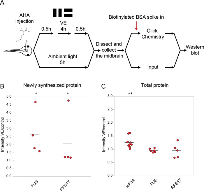 Figure 2âfigure supplement 1. Validation of changes in synthesis of eIF3A, FUS, and RPS17 in response to 4 hr of visual experience.(A) Protocol to prepare AHA-labeled samples for western blot. (B, C) Scatter plots of western blot data of newly synthesized (B) or total (C) CPPs. Data are normalized intensity ratios of VE samples compared to the paired controls. The intensities of individual bands for total proteins were normalized to β-tubulin, while the intensities of bands for NSPs were normalized to biotinylated BSA, which served as an internal standard, and β-tubulin. Western blots of CPPs (red) corroborated the proteomic results. *p<0.05, **p<0.01, two-tailed Studentâs t test for comparisons of total proteins and Mann-Whitney test for comparisons of NSPs. n â¥Â 4 independent experiments for each CPP. The black bars represent the mean. |