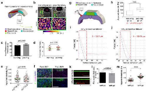 In vivo atomic force microscopy (iAFM) measurements. (g) iAFM measurement direct on mesoderm. (i) Spread of data for each stage, green lines represent median, red whiskers interquartile ranges (two-tailed Mann–Whitney ****P<0.0001, CI= 95%, nstage13= 259, nstage17= 236, nstage20= 461 AFM-indentations, N= number of animals. δ= average indentation depth). Scale bars (b, c) 150 μm, (f, i) 100 μm. NC, neural crest; e, eye; hm, head mesoderm. b,c,f,i representative examples from 3 independent experiments, CI= 95%.