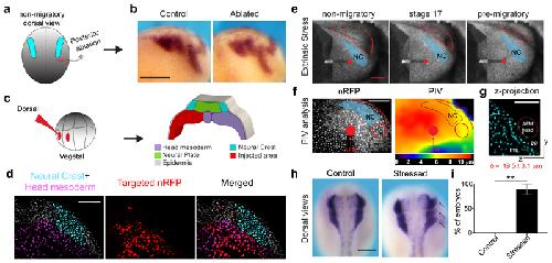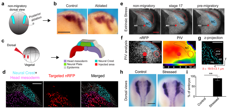 Extended Data Figure 4. Posterior ablations, mesoderm targeted injections, and extrinsic compression characterisation.(a–b) Ablation controls. Mechanical tension in Xenopus is higher in the anterior region of the embryo than in posterior territories12,41. Consistent with this observation, no effect on NC migration or tissue stiffness was observed when the ablation was done in posterior regions. (a) Schematic showing embryos ablated at non-migratory stages, and NC migration at stage 23 (migratory)7. (b) Lateral views of Control and posteriorly ablated embryos hybridised with a probe against snail2. (c–d) Targeted injections to the head mesoderm. (c) Cartoon shows that injecting 2 dorso-vegetal blastomeres targets the head mesoderm. (d) Confocal images of targeted injections showing nuclear RFP expression in the mesoderm, panels as labelled in the figure. Scale bars (b) 250 μm, (d) 100 μm. (e–g) Compression controls. (e) Images of embryos being compressed from non- to pre-migratory stages with a 90-micron diameter bead attached to an AFM cantilever (bead, red circumference), neural plate border highlighted with red lines and NC position shown in light-blue, stages as labelled. (f) Magnitude maps from a particle image velocity (PIV) analysis indicates the x/y extent of the deformation induced by AFM indentation. (g) Maximum projection of a cross-section showing the z-deformation generated by the AFM compression, epidermis (ep) and mesoderm (ms) are being deformed, averaged maximum indentation depth (δ) is provided (nuclei are visible in the bead region due to a maximum projection effect). (h,i) Result of extrinsic stress experiments. (h) Dorsal view (anterior to top) of embryos hybridised with a probe against snail2, black arrows point to migrating NC. (i) Percentage of embryos displaying NC migration, histograms represent media, error bars s.e.m. N= 13 animals (two-tailed t-test **P=0.0010, CI= 95%). All experiments repeated three times. Scale bars (e, f) 200 μm, (g) 100 μm, (h) 200 μm.