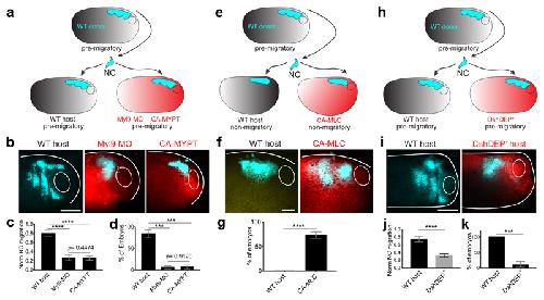 Extended Data Figure 5. Mesodermal stiffening promotes neural crest collective migration in a non-autonomous manner in vivo.(a–d) Non-autonomous effect of mesodermal myosin manipulations on NC migration in vivo. (a) Wild type labelled pre-migratory NC (cyan) grafted into pre-migratory wild type (WT), Myl9-MO, or CA-MYPT injected hosts (mesoderm in red). (b) Representative embryos showing normal NC migration in WT hosts and inhibited NC migration in Myl9-MO or CA-MYPT hosts. (c) Normalised NC migration N= 22 animals and (d) percentage of embryos displaying NC migration (one-way ANOVA P <0.0001; two-tailed t-test ***P<0.0006, ****P<0.0001, CI= 95%, N= 38 animals). Histograms in c, d, g represent media, error bars in c SD or s.e.m in d,g. (e–g) Effect of premature mesodermal stiffening on NC migration in vivo. (e) Wild type labelled pre-migratory NC grafted into non-migratory wild type (WT), or CA-MLC hosts. (f) Representative embryos showing premature NC migration in CA-MLC hosts, while no migration is observed in control embryos at this stage. (g) Percentage of embryos displaying NC migration, two-tailed t-test ****P<0.0001, CI= 95%, N= 20 animals. (h-k) Non-autonomous effect of DshDEP+ on NC migration. (h) Wild type labelled pre-migratory NC (cyan) was grafted into pre-migratory wild type (WT), or DshDEP+ hosts. (i) Representative examples showing NC migration in WT hosts and inhibited NC migration on DshDEP+ injected hosts (mesoderm in red). (j) Normalised NC migration and (k) percentage of embryos displaying NC migration (two-tailed t-test ***P<0.0002 ****P<0.0001, CI= 95% N= 14 animals). Histograms in j, k represent media and error bars (j) s.e.m and (d) SD. b,f,i are representative examples of 3 independent experiments. Scale bars (b) 200 μm, (f) 100 μm, (i) 150 μm.