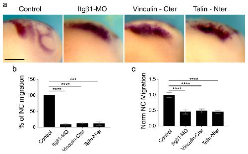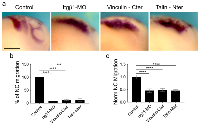 Extended Data Figure 7. NC senses mesoderm stiffening by using an Integrin/Vinculin/Talin-mediated mechanoresponsive mechanism.(a–c) Analysis of NC migration after Integrin-β1, Vinculin or Talin knockdown. (a) Lateral views of embryos hybridised with a probe against snail2. Control embryos migrate normally from dorsal to ventral. However, NC migration is drastically inhibited in embryos treated with Itgβ1-MO or the negative dominants Vinculin-Cter or Talin-Nter. Embryos in a are representative examples of 3 independent experiments. (b–c) quantification of neural crest migration showing (b) percentage of embryos and (c) normalised NC migrated distances. Histograms represent media, error bars SD. (one-way ANOVA P <0.0001, two-tailed t-test ***P<0.0002 ****P<0.0001, CI= 95%). N= 39 embryos. Scale bar 200 μm.