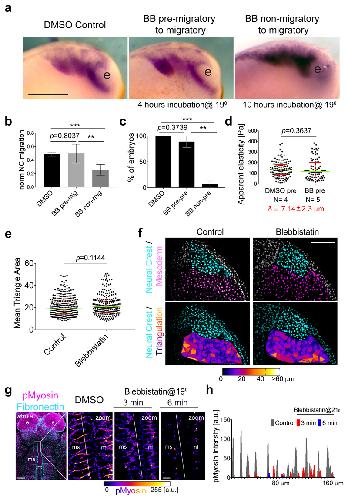 d represent medians and SD respectively (one-way ANOVA P <0.0001, two-tailed t-test **P<0.008, ***P<0.002, CI= 95%, N= 19 animals). (d) iAFM measurement direct on mesoderm; Spread of data plotted for each condition, green lines represent median, red whiskers the interquartile range (two-tailed Mann–Whitney test, p value as indicated, CI= 95%, n= number of AFM-indentations, nDMSO= 116, nBB_pre= 204, N= number of animals, δ= averaged maximum indentation depth). (e–f) As blebbistatin treatment could affect cell-cell adhesion promoting cell dispersion, we measured its effect on cell dispersion by calculating the distance between neighbor mesoderm cells. (e) Chart comparing the mean area of the triangle formed by each mesoderm cell with its neighbours, calculated by Delaunay triangulation (Mann Whitney test p value as shown). (f) Images showing neural crest and mesoderm cells (treated as indicated) and triangles from which the areas were calculated. Scale bar 200 μm (g) Immunostaining for phospho-Myosin (pMyosin), dorsal view of a flat-mounted embryo and color-coded intensity of zoom images at the indicated time points are shown (scale in arbitrary units). (h) Fluorescence intensity in arbitrary units [a.u.] across the white line in the zoom panels. All experiments repeated at least three times. a,f,g are representative examples of 3 independent experiments. Scale bars (b) 150 μm, (e, whole) 100 μm, (e, zoom) 15 μm. ms, mesoderm; nt, notochord; e, eye.