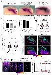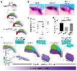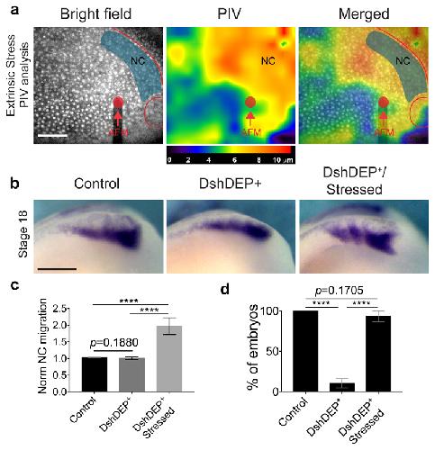 Extended Data Figure 10. Extrinsic compression modifies the environment of PCP depleted embryos and triggers premature neural crest collective migration, in vivo.(a), Magnitude maps from a particle image velocity (PIV) analysis presented to facilitate the visualisation of the x/y extent of the stress field generated by the extrinsic compression experiment (scale bar in microns). Neural plate border shown in red lines, neural crest in light blue. (b–c) Extrinsic stress-induced premature NC migration. (b) Lateral views of embryos hybridised with a probe against snail2, notice NC premature migration is observed in the DshDEP+/Stressed panel. (c) Normalised NC migration and (d) percentage of embryos displaying each phenotype are shown. Histograms and bars represent media and SD, (one-way ANOVA P <0.0001, two-tailed t-test ****P<0.0001, CI= 95%, N= 18 animals). Images in a and b are representative examples of 3 independent experiments. Scale bars (a) 200 μm, (b) 150 μm.