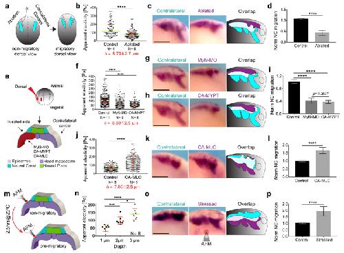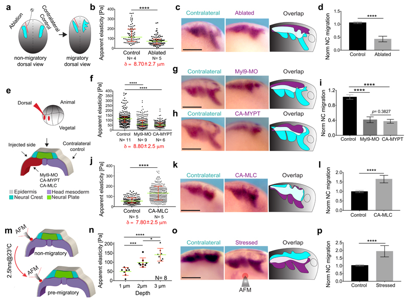 snail2-hybridised embryos. (p) Normalised NC migration (Np= 13 animals). Overlap drawing in c,g,h,k,o shown to facilitate comparison of NC migration, control NC (cyan) and treated NC (magenta). b,f,j iAFM measurements direct on mesoderm, spread of data; green lines represent median, red whiskers interquartile range (two-tailed Mann–Whitney, ****P<0.0001, CI= 95%, N= number of animals, δ= averaged maximum indentation depths). Histograms in d,i,l,p represent media, error bars SD (one-way ANOVA P <0.0001; two-tailed t-test *P=0.014, ***P <0.001, ****P<0.0001, CI= 95%). c,g,h,k,o representative examples from three independent experiments. Scale bars 200 μm.