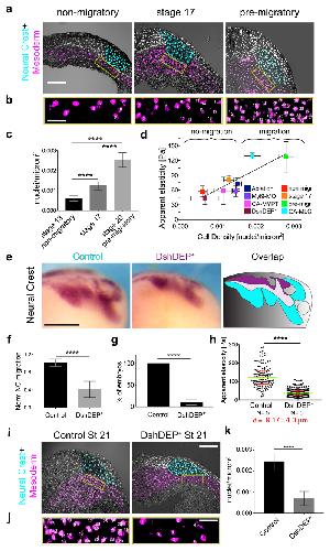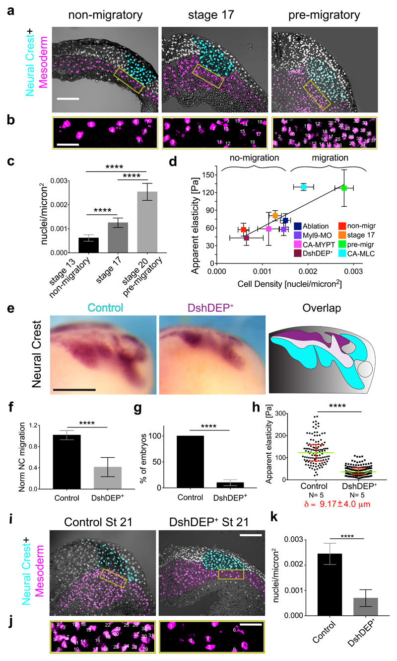 Figure 3. PCP-dependent convergent extension is the driving force for mesodermal stiffening.(a–d) Cell density analysis. (a) Cross-sections of embryos at the indicated stages showing embryo morphology and pseudo-stained nuclei for NC (cyan) and mesoderm (magenta). (b) Magnification of the area used to quantify cell density. (c) Nuclei density under the NC (N= 27 sections). (d) Head mesoderm apparent elasticity as a function of cell density (Pearson test R= 0.8627, N= 16 animals). (e–k) Effect of DshDEP+. (e) Lateral views and overlaps of Control (cyan) or DshDEP+ (magenta) snail2-hybridised embryos. (f) Normalised NC migration (N=14 animals), (g) Percentage of embryos. (h) iAFM measurement direct on mesoderm; spread of data, green lines represent median, red whiskers interquartile range (two-tailed Mann–Whitney, ****P<0.0001, CI= 95%, ncontrol= 120, nDshDEP+= 148, N= number of animals, δ= averaged maximum indentation depth). (i) Overlay showing embryo morphology and nuclei. (j) Magnification showing the area used to quantify cell density. (k) Nuclei density under the NC, (N= 11 animals). Histograms in c, f, g, k represent media, error bars SD, or s.e.m in g (one-way ANOVA P <0.0001; two-tailed t-test ****P<0.0001, CI= 95%). Scale bars (a, b, i, j) 100 μm, (e) 200 μm. a,e,c,f,g,k representative examples from three independent experiments.