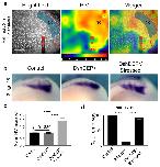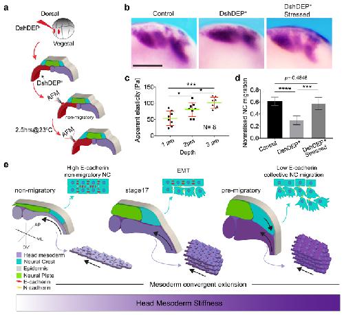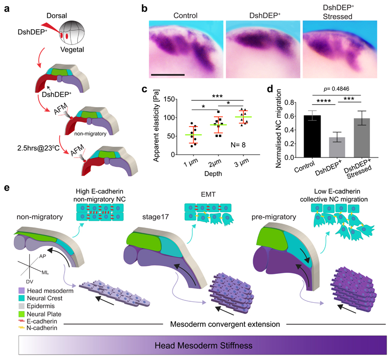 Figure 4. PCP loss-of-function is mechanically rescued by extrinsically inducing mesodermal stiffening.(a–d) Mechanical rescue of DshDEP+ induced defects. (a) Graphic description of compression experiments. (b) Lateral view of snail2-hybridised embryos. (c) Induced apparent elasticity plotted as a function of indentation depth, Nc= 8 animals, green lines represent median and whiskers show the spread of data (excluding outliers). (d) Normalised NC migration, N= 19 animals. b,d representative examples from three independent experiments. Histograms in c, d represent media and error bars SD (one-way ANOVA P <0.0003; two-tailed t–test *P<0.045, ***P<0.0002, ****P<0.0001, CI= 95%, δ = average indentation depth. Scale bars (b) 200 μm. (e) Schematic representing how mechanical interaction between mesoderm and NC coordinates morphogenesis. As convergent extension progress, the mesoderm stiffens, and in turns, NC epithelial-to-mesenchymal transition (EMT) is triggered and CCM proceed (AP, anteroposterior; ML, mediolateral; DV dorsoventral). NC, Neural crest.