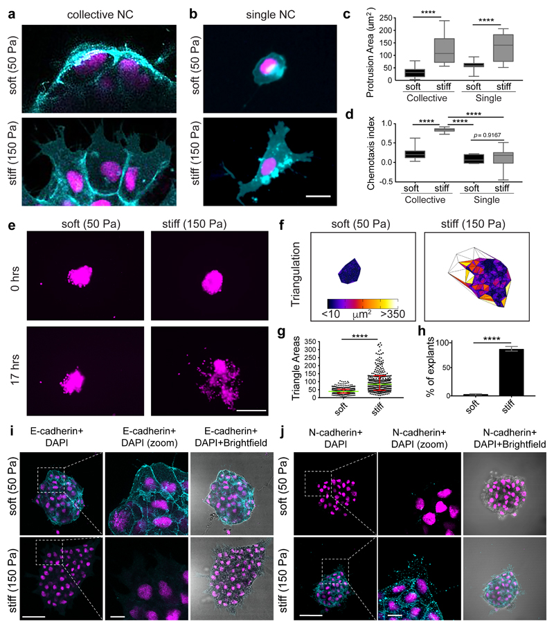 Extended Data Figure 3. Neural crest motility, dispersion, and EMT are controlled by substrate mechanics.(a–d) Protrusion and chemotaxis analysis of collective and single NC cells plated on soft and stiff substrates. (a) Confocal projections of labelled NC collectives plated on soft or stiff gels. (b) Confocal projections of labelled single NC cells plated on soft or stiff gels. (c) Protrusion area and (d) chemotaxis quantifications for collective and single NC cells plated on soft or stiff gels, boxes show the 25th, median, and 75th percentiles; whiskers show the spread of data (excluding outliers) Nprotrusion_area= 63 cells, Nchemotaxis= 79 cells (one-way ANOVA P <0.0001, two-tailed t-test ****P<0.0001, CI= 95%). (e–h) NC dispersion analysis on gels of varying stiffness. (e) NC cells labelled with nRFP and plated on stiff or soft gels are shown at 0 and 17 hours after plating. (f–h) quantification of cell dispersion. (f) Color-coded Delaunay triangulation shown at 17 hours after plating to facilitate visualization of the distances between neighbor cells. (g) Quantification of Delaunay triangulation, spread of data for each condition is plotted, green lines represent median, red whiskers the interquartile range (two-tailed Mann–Whitney, ****P<0.0001, CI= 95%, Ng= 730 triangles from 31 explants. (h) percentage of dispersing explants, histograms represent media and error bars s.e.m. (two-tailed t-test ****P<0.0001, CI= 95%, Nh= 31 explants) g and h, are data from 4 independent experiments (soft) and 3 independent experiments (stiff). (I,j) Immunostaining for (i) E-cadherin and (j) N-cadherin on NC plated on substrates of varying stiffnesses. a–b,e,i,j representative examples of 3 independent experiments. Scale bars (a,b) 20 μm, (e) 250 μm, (I,j) 50 μm, (I,j, zoom) 10 μm.