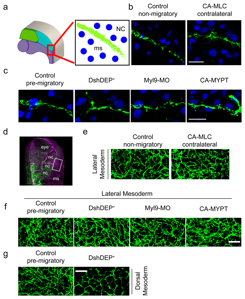 Extended Data Figure 6. Head mesoderm manipulations did not affect Fibronectin deposition and organization under the NC.As it has been previously described that myosin and PCP inhibition can affect Fibronectin deposition and organization in dorsal mesoderm27,28,42; we analyse the effect of these treatment in the lateral mesoderm underlying the premigratory NC. Our results show no effect of myosin or PCP inhibition in Fibronectin deposition or organization in lateral mesoderm, indicating that the effect of our treatments on NC migration are not due to an indirect effect on Fibronectin, but rather a consequence of affecting mesoderm stiffness. (a–c) Transverse sections showing Fibronectin expression under different treatments used to manipulate head mesoderm’s apparent elasticity. (a) Schematic showing the area presented in b–c. (b–c) Immunostaining against Fibronectin (green) and DAPI stain (blue) showing Fibronectin signal underneath the NC, treatments as labelled in each panel. Scale bar 30 μm. (d–g) Effect of mesoderm manipulation on Fibronectin assembly. (d) Dorsal view of a flat-mounted embryo, white square indicates the area shown in b and c. (e) Immunostaining against Fibronectin (green) in non-migratory embryos (stage 13), showing Fibronectin assembly underneath the NC, treatments as indicated. (f) Immunostaining against Fibronectin (green) in pre-migratory embryos (stage 20) showing Fibronectin assembly underneath the NC, treatments as indicated. (g) Control to show that inhibition of PCP signaling (DshDEP+) affects Fibronectin assembly of dorsal mesoderm42, but not in lateral mesoderm (f). Scale bars 30 μm. b–c and e–g are representative examples of 3 independent experiments.
