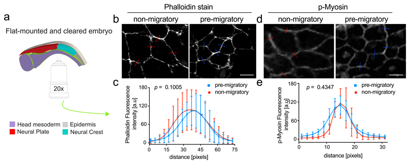 Extended Data Figure 8. Actomyosin expression in the head mesoderm does not change from non- to pre-migratory stages.(a–e) Analysis of actin and phospho-myosin expression under the NC. As actomyosin contractility has been proposed to contribute to paraxial mesoderm stiffness in Xenopus13, we assessed actomyosin activity in the head mesoderm, the substrate of the NC. Note that the expression levels of either actin or p-myosin remained unchanged at pre-migratory stages compared to non-migratory stages. (a) Schematic showing the imaging method used to access the head mesoderm under the NC. (b) Phalloidin stain was used to label actin on embryos at non- and pre-migratory stages. (d) Immunostaining against phospho-myosin on embryos at non- and pre-migratory stages. (c–e) quantification of fluorescence intensity across the membrane represented by a continuous line, each point represents media and error bars SD; n, number of measurements per data (time) point, nc= 16, ne= 15, from 3 independent experiments, non-significant differences were observed, p value is indicated in each chart (two-tailed t-test, CI= 95%). Scale bars 20 μm.
