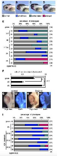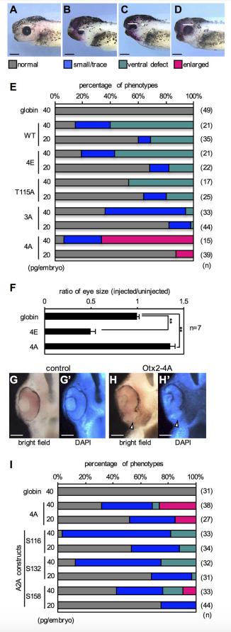 Fig. 3. Eye phenotypes caused by Otx2 mutants. (A-D) Representative eye phenotypes. mRNAs for Otx2 construct and nbgal as a tracer were co-injected into the presumptive eye field of the dorsal-left blastomere at the four-cell stage. Phenotypes were scored at stages 38-42: normal indicates normallooking eyes; small/trace indicates small or trace eye; ventral defect indicates normal eye width with pigmentation defect on the ventral side; enlarged indicates enlarged eye. Some injected embryos showed gastrulation arrest, which were removed from the total scores. White bars indicate the diameter of the eye. Anterior to the left, dorsal is up. (E) Incidence of eye phenotypes. See A-D for color codes of phenotypes. mRNAs for Otx2 construct or globin (negative control) was injected at 20 or 40 pg/embryo as indicated. n indicates the total number of scored embryos. (F) Quantitative analysis of the eye size. **P<0.01 (Studentâs t-test); error bars, s.e.m.; n indicates the number of samples. (G-Hâ²) Transverse hemisection across the left eye. (G,Gâ²) Control. (H,Hâ²) Enlarged eye caused by Ox2-4A. (G,H) Bright field. (Gâ²,Hâ²) DAPI staining. Arrowheads indicate pigmentation defect in the ventral retina. (I) Incidence of eye phenotypes caused by Otx2-A2A constructs. In the A2A constructs, the remaining intact serine residue is indicated. Scale bars: 500 μm in A-D; 100 μm in G,H. |