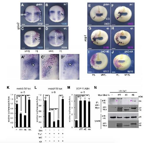 Fig. 7. Repression and/or activation activities of Otx2-4E and -4A and Tle interaction. (A-D) WISH for gbx2 at the late gastrula to early neurula stage (stages 12.5-13). Dorsal view with anterior up. (Aâ²,Câ²,Dâ²) Enlarged images of A, C and D (dashed white box). (E-J) WISH for xcg1 at the late neurula stage (stages 18-20). Anterior view with dorsal up. CG indicates the cement gland. mRNA injection was the same as in Fig. 6. Colors of numbers and arrowheads are the same as in Fig. 4. (K-M) Luciferase reporter assays. meis3-D2-luc reporter DNA was co-injected with mRNA for Otx2-WT, -4E or -4A (50 pg/embryo) (K) or with combinations of mRNAs for Gsc (12.5 pg/embryo), Tle1 (12.5 pg/embryo), Otx2-WT and -4A (25 pg/embryo) as indicated (L). SOP-FLASH reporter DNA was co-injected with mRNA for Otx2-WT, -4E or -4A (50 pg/embryo) (M). **P<0.01 (Studentâs t-test); error bars, s.e.m.; N.S., not significant; n indicates the number of samples. (N) Physical interaction between Tle1 and Otx2FL mutants as assayed by Co-IP. The amounts of expressed protein were verified by western blotting (lower panels). Apparent molecular masses (kDa) of Myc-Otx2FL-WT, -4A and -4E were 50, 50 and 57, respectively. Magenta arrowheads indicate co-immunoprecipitated bands; circles indicate heavy chains of IgG from the anti-Myc antibody. Scale bars: 300 μm in A-J,Aâ²,Câ²,Dâ². |