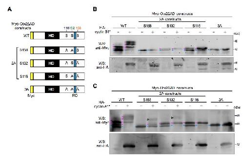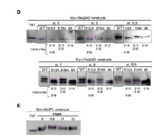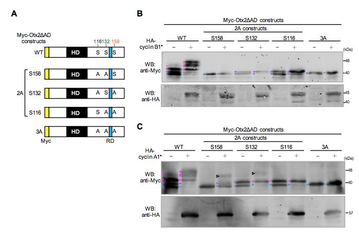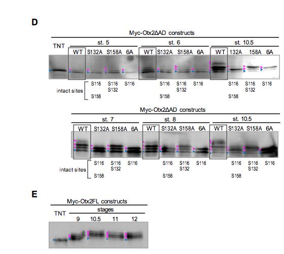 Fig. S5. Preference of cyclin B/Cdk and cyclinA/Cdk for C/sites of Otx2. (A) Schematic presentation of Myc@Otx2ΔAD with double (2A) and triple alanine (3A) mutations at S116, S132 and S158. To test a preference of cyclin B/Cdk and cyclin A/Cdks for Otx2 phosphorylation, double alanine mutants (2A) for S116, S132 and S158 in ΔAD were constructed, in which only one site is responsible for Otx2 phosphorylation. In the 2A constructs, for example, the S158 construct indicates mutations at S116 and S132. Yellow box, Myc@tagY black box, homeodomain (HD)Y blue box, repression domain (RD). S, serine phosphorylation sites (S116, S132, S158)Y A, alanine mutation. (B) Western blotting of Myc@Otx2ΔAD constructs (2A or 3A) co@expressed with (+) or without (@) HA@cyclin B1*. The intensity of modified bands of S132 (S116A/S158A) and S116 (S132A/S158A) constructs, but not that of S158 (S116A/S132A), was increased by HA@cyclin B1* expression. (C) Western blotting of Myc@Otx2ΔAD constructs (2A or 3A) co@expressed with (+) or without (@) HA@cyclin A1*. All modified bands were enhanced by HA@cyclin A1* expression, with an additional modified band (white arrowheads). These data suggest that S116 and S132 have a preference for both cyclin B/Cdk and cyclin A/Cdks, and that S158 has it for cyclin A/Cdks, if Otx2 is directly phosphorylated by cyclin/Cdks. (D,E) Developmental changes of phosphorylation of Otx2 as assayed by using Myc@ Otx2ΔAD (D) and Myc@Otx2FL (E) constructs. The wild type (WT) and alanine mutants of a single serine at S132 (S132A) and S158 (S158A), and of 6 serines at S122, S123, S132, S153, S158, and S161 (6A) in Myc@Otx2ΔAD constructs were analyzed from stages 5 to 10.5 as indicated. Note that the 6A construct has S116, which is a phosphorylation site. Mutation at S132 (S132A and 6A constructs) reduced phosphorylation levels compared to S158 mutation, indicating that S132 and S116 are more efficiently phosphorylated than S158 during cleavage stages. Myc@ Otx2FL was analyzed at stages 9 to 12 as indicated. TNT, in vitro translation productsY blue arrowheads, nascent bandsY magenta arrowheads, modified bands. Blue arrowheads, nascent proteinsY magenta arrowheads, modified proteinsY white arrowheads, additional modified bands at sites other than S116, S132 and S158. |