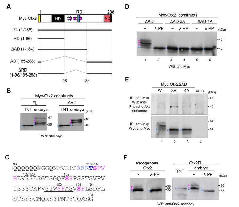 Fig. 1. Exogenous and endogenous Otx2 is phosphorylated. (A) Schematic structures of Myc-Otx2 and deletion constructs. HD, homeodomain; RD, repression domain; AD, activation domain; yellow box, Myc-tag; white star, Akt site; pink stars, Cdk sites. FL and deletion constructs are indicated by thick lines and positions of amino acid residues. (B) Western blotting of Myc-FL and Myc-δAD. TNT, in vitro translational products; embryo, lysate from Xenopus gastrula embryos expressing constructs as indicated. (C) Amino acid sequence of Otx2 from position 96 to 184. Numbers, position of amino acid; underline, repression domain; magenta, putative Cdk site; blue, putative Akt site; bold, possible phosphorylation sites identified in this study. (D) Western blotting of MycOtx2δAD constructs, WT, 3A and 4A. Lysates were treated with or without λ-PP. (E) IP-western assay for phospho-Akt sites. Myc-Otx2δAD was immunoprecipitated with anti-Myc antibody and subjected to western blotting with the anti-Phospho-Akt substrate antibody (upper) or anti-Myc antibody (lower). uninj. indicates uninjected control. The reasons why no clear band was detected in WT (lane 1) might be that: (i) phospho-Akt signals were dispersed in several shifted bands caused by phosphorylation at other sites; and (ii) phosphorylation at T115 was inhibited by phosphorylation at S116 or the other sites. (F) Western blotting of endogenous Otx2 (left) and exogenous Otx2FL (right) with anti-Otx2 antibodies. Lysates were treated with or without λ-PP. Apparent molecular masses (kDa) of the nascent and upper-most modified bands are indicated on the right (B,D-F). Calculated and apparent molecular masses of constructs (kDa): Myc-Otx2FL, 43 and 50; Myc-Otx2δAD, 32 and 40; Otx2FL, 31 and 33. White arrowhead indicates a band resistant to λ-PP or incomplete digests. 3A, alanine mutant at S116, S132 and S158; 4A, alanine mutant at T115, S116, S132 and S158; blue arrowheads indicate nascent proteins; magenta arrowheads indicate modified proteins. The amount of injected mRNA (pg/embryo) was Myc-Otx2FL and Myc-Otx2δAD, 500; Otx2FL, 250. Antibodies used for western blotting (WB) or IP were as indicated. |