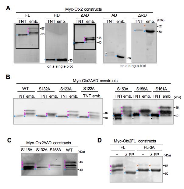 Fig. S1. Post/translational modifications ofOtx2 aroundthe repressiondomain. Western blot analysis of Myc@Otx2 constructs expressed in X. laevis embryos. (A) Myc@Otx2 (FL) and its deletion constructs (HD, ΔAD, AD and ΔRD). Boxes indicate the data presented in Fig. 1B. ΔRD appeared to have a modified band (orange arrowhead). (B) WT and alanine mutants at S132 (S132A), S123 (S123A), S122 (S122A), S153 (S153A), S158 (S158A) and S161 (S161A) in Myc@Otx2ΔAD constructs. (C) WT and alanine mutants at S116 (S116A), S132 (S132A), S158 (S158A) in Myc@Otx2ΔAD constructs. (D) λ@PP treatment removed most modified bands of WT and 3Aconstructs of Myc@Otx2FL. Note that the different electrophoretic mobility of nascent bands (blue arrowheads) between FL and FL@3A may be due to substitutions of serine with alanine, though Myc@Otx2@ΔAD and ΔAD@3A migrated similarly (see Fig. 1D). Calculated and apparent molecular masses of constructs (kDa) were 43 and 50 for Myc@Otx2FL, 22 and 30 for Myc@Otx2@HD, 32 and 40 for Myc@Otx2ΔAD, 23 and 35 for Myc@Otx2@AD, and 34 and 50 for Myc@Otx2ΔRD, respectively. Black circles, undesired products or degradation productsY orange arrowheads, bands resistant to λ@PP, which may correspond to an upper band of ΔRD in panelA. |