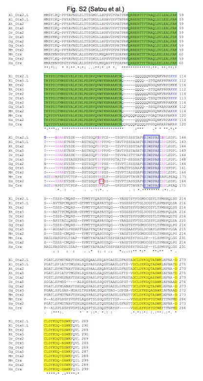Fig. S2. Alignment of amino acid sequences of Otx2 and Otx5/Crx among vertebrates. Abbreviations of species are Xenopus laevis (Xl), Xenopus tropicalis (Xt), Danio rerio (Dr), Gallus gallus (Gg), Mus musculus (Mm) and Homo sapiens (Hs). Protein sequences were obtained from the NCBI database: Xl_Otx2.L (NP_001084955), Xl_Otx5.L (NP_001081916), Xt_Otx2 (NP_001016177), Xt_Otx5 (NP_001016021), Dr_Otx2 (NP_571326), Dr_Otx5 (NP_851848), Gg_Otx2 (NP_989851), Gg_Otx5 (NP_001288716), Mm_Otx2 (NP_001273412), Mm_Crx (NP_031796), Hs_Otx2 (NP_001257453), Hs_Crx (AAH53672). Boxes coloured in green, homeodomainY blue, SIWSPAS motifY yellow, repeated Otx tail motifY red, Otx2 mutation sites (P133 and P134) that were reportedly associated with human ocular malformation. Blue or magenta letters, consensus motifs for Akt and Cdks. Bold cases, putative phosphorylation sites of Otx2 as shown in this study. |