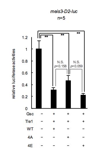 Fig. S7. Repression activity of Otx2/4A and /4E together with Gsc and Tle1. Experimental procedures were the same as Fig. 7L. Repression activity of Otx2@4A requires Gsc for meis3CD2Cluc reporter. meis3CD2C luc reporter DNA was co@injected with mRNAs for Gsc (12.5 pg/embryo), Tle1 (12.5 pg/embryo), Otx2@WT, or @4A (25 pg/embryo), or 4E (25 pg/embryo) as indicated. **P<0.01 (t@test)Y error bars, s.e.m.Y N.S., not significantY n, the number of samples. |