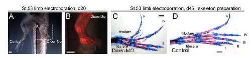 Dicer-Mo injected (C) and control (D) limbs, 45 days after Dicer-Mo injection/electroporation. IâV indicate digit identities. Scale