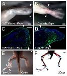 injected limb, 20 days after electroporation. Red fluorescence shows the distribution of Dicer-Mo. Skeletal staining of