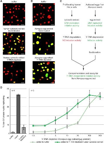 Figure 1. Y RNA-Independent Initiation Activity in Xenopus Egg Extracts(A) Y RNA-dependent initiation of DNA replication in a human cell-free system. Human late G1 phase template nuclei were incubated in either buffer (top) or mock-treated or Y RNA-depleted cytosolic extracts.(B) Y RNA-independent initiation of DNA replication in Xenopus egg extracts. Human late G1 phase template nuclei were incubated in either buffer (top) or mock-treated or Y RNA-depleted Xenopus egg extracts. Representative immunofluorescence micrographs are shown with merged channels for total DNA (propidium iodide, red) or sites of DNA replication (digoxigenin-deoxyuridine triphosphate [dUTP] incorporation, green).(C) Experimental design for the detection and isolation of the initiation activity from Xenopus egg extracts by cross-species complementation assays.(D) Cross-species complementation assays. Left: template nuclei were incubated as in (A) in either buffer or mock-treated cytosolic or Y RNA-depleted human cytosolic extracts. Right: increasing amounts of Y RNA-depleted Xenopus egg extracts were added to replication initiation reactions in the presence of either buffer (light green) or Y RNA-depleted human cytosolic extract (dark green). Percentages of replicating template nuclei for each reaction are shown as mean values ± SD of n independent experiments.Scale bars, 10 μm.