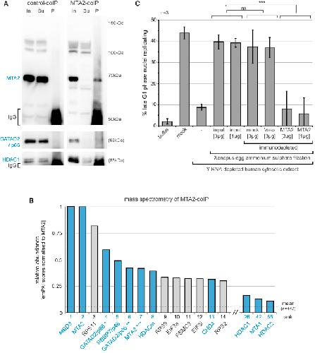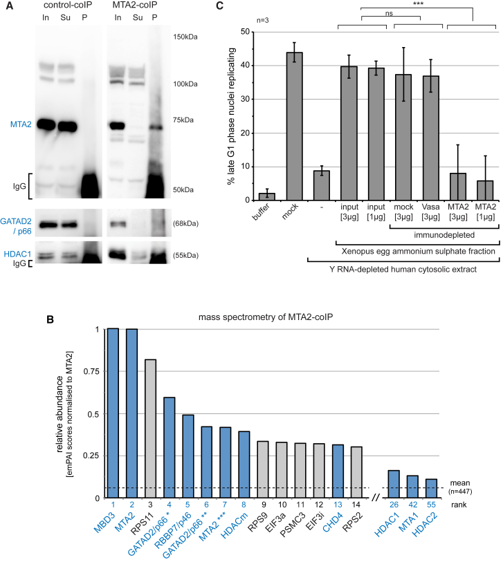 Figure 3. The Xenopus NuRD Complex Has DNA Replication Initiation ActivityNuRD was immunoprecipitated with MTA2-specific antibodies from the 20%–45% ammonium sulfate fraction of the activated Xenopus laevis egg extract.(A) Co-immunoprecipitation of GATAD2/p66 and HDAC1 subunits with MTA2, as confirmed by western blotting. Input (In), supernatant (Su), and washed pellet (P) of the control and MTA2 coIPs are shown, 10% of the total was loaded per lane for each.(B) Mass spectrometry analysis of co-immunoprecipitated material. Xenopus proteins (n = 447) uniquely identified only in the immunoprecipitate and not in the control IP were ranked according to their quantitative emPAI values after normalization to emPAI (MTA2) = 1. The top 14 most abundant proteins are plotted together with additional NuRD subunits. NuRD subunits are shown in blue. The mean normalized emPAI value of all proteins is indicated by a dashed line. Separate and additional isoforms were identified in the Uniprot database for GATAD2/p66 (∗LOC398154; ∗∗LOC100158394, isoform X2) and MTA2 (∗∗∗MGC83056), respectively.(C) Immunodepletion. xNuRD was co-immunoprecipitated with MTA2-specific antibodies as indicated above. Control immunoprecipitations were performed with either empty beads (mock) or with antibodies specific for Drosophila Vasa protein. The indicated protein amounts of immunodepleted supernatants were added to Y RNA-depleted DNA replication initiation reactions. Mean values ± SD of percentages of replicating template nuclei are plotted from n = 3 independent experiments. Brackets indicate results of t tests (unpaired, two-tailed with unequal variance) of experimental and control samples against the untreated input samples (ns, not significant; ∗∗∗p ≤ 0.001).See also Table S2.