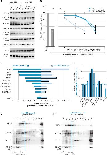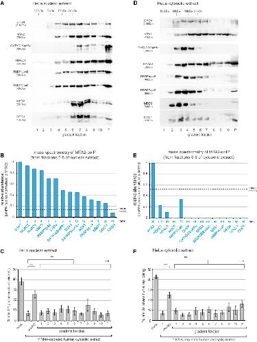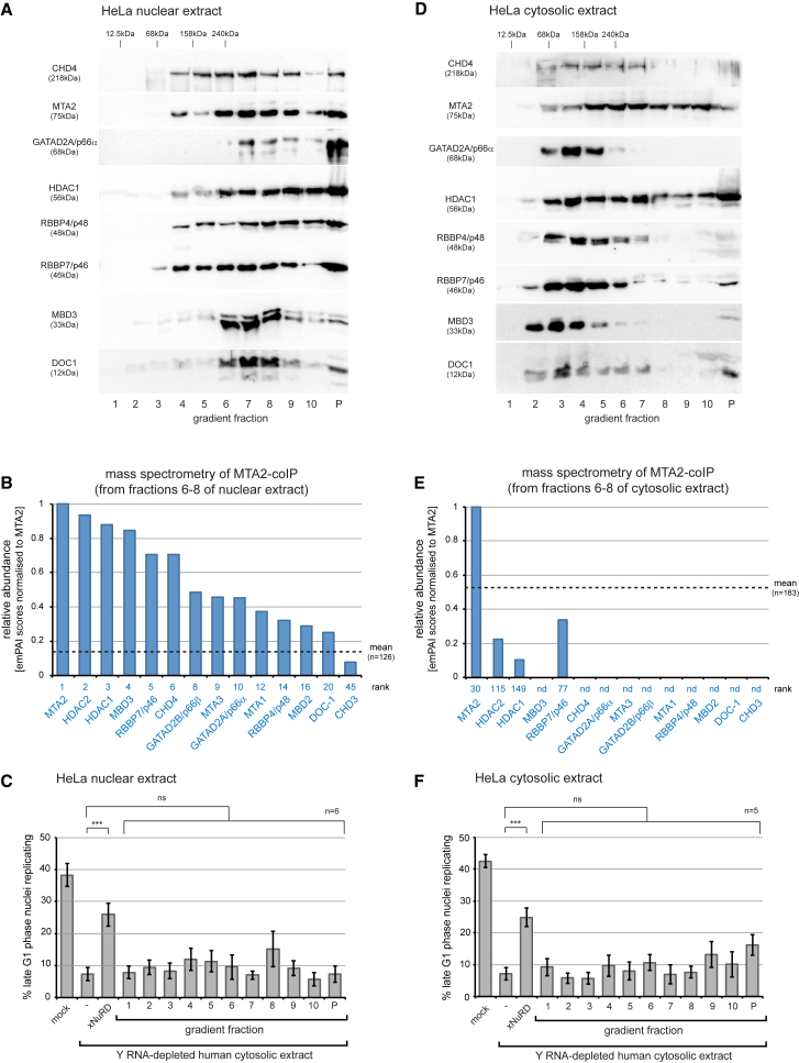Figure 4. Human NuRD Complexes Are Structurally and Functionally Distinct from xNuRD(A–F) Proliferating human HeLa cells were fractionated into nuclear (A–C) and cytosolic extracts (D–F), and each extract was partially sub-fractionated by precipitation with 20%–45% ammonium sulfate and ultracentrifugation through preparative sucrose gradients.(A and D) Western blot analyses of human NuRD subunits. Fractions of the preparative sucrose gradients of nuclear (A) and cytosolic extracts (D) were analyzed by western blotting with antibodies specific for the indicated human NuRD subunits.(B and E) Mass spectrometry analysis of the MTA2 co-immunoprecipitations. Fractions 6–8 of the preparative sucrose gradients of nuclear (B) and cytosolic extracts (E) were pooled, and human NuRD was immunoprecipitated with anti-MTA2 antibodies. Human proteins identified in the immunoprecipitates (n = 126 and n = 183 for nuclear and cytosolic extracts, respectively) were ranked according to their quantitative emPAI values after normalization to emPAI (MTA2) = 1, and all human NuRD subunits detected are plotted with their rank. The mean normalized emPAI values of all proteins are indicated by dashed lines.(C and F) Activity profiles of the sucrose fractions. Template nuclei were incubated in Y RNA-depleted human cytosolic extract supplemented with the indicated gradient fractions of the nuclear (C) and cytosolic extracts (F). Mean values ± SD of percentages of replicating template nuclei are plotted of n independent experiments. Brackets indicate results of t tests (unpaired, two-tailed with unequal variance) of the positive control (xNuRD) and experimental samples against the Y RNA-depleted background (∗∗∗p ≤ 0.001).See also Figures S2 and S3 and Table S3.