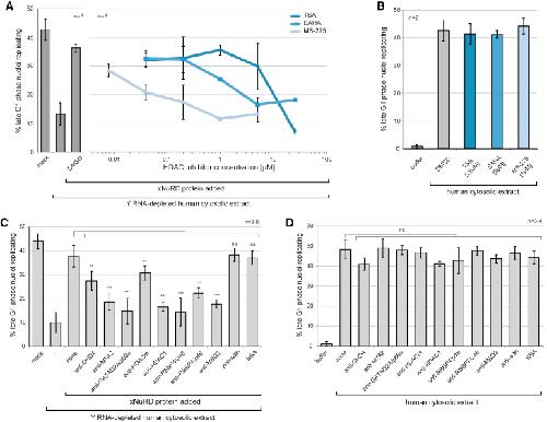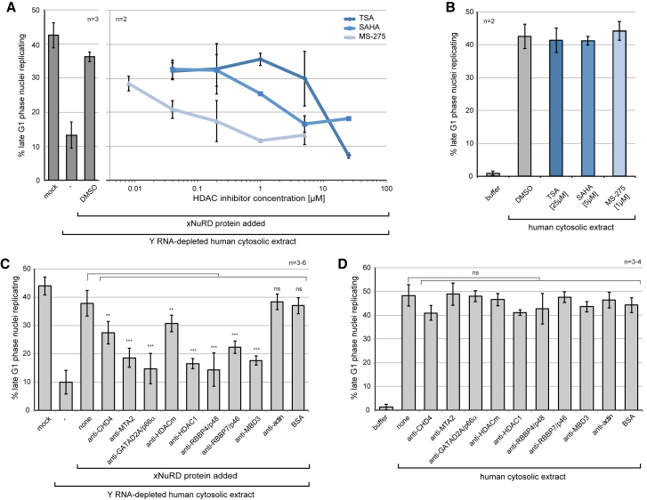 Figure 5. Inhibition of xNuRD Leads to an Inhibition of Y RNA-Independent DNA ReplicationShown is inhibition of DNA replication using HDAC inhibitors and NuRD-specific antibodies.(A) Template nuclei were incubated in Y RNA-depleted human cytosolic extract supplemented with partially purified xNuRD and the indicated concentrations of the HDAC inhibitors trichostatin A (TSA), SAHA, and MS-275.(B) Template nuclei were incubated with human cytosolic extract containing human NuRD and Y RNAs in the presence of the indicated inhibitors.(C) Template nuclei were incubated in Y RNA-depleted human cytosolic extract supplemented with partially purified xNuRD and the indicated NuRD-specific antibodies.(D) Template nuclei were incubated with human cytosolic extract containing human NuRD and Y RNAs in the presence of the indicated NuRD-specific antibodies. Mean values ± SD of the percentages of replicating template nuclei are plotted from n independent experiments. Results of t tests (unpaired, two-tailed with unequal variance) of treated experimental samples against the no addition controls are indicated (∗∗p ≤ 0.01; ∗∗∗p ≤ 0.001).