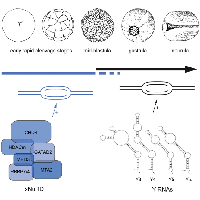 Figure 7. xNuRD Is Required for Development and DNA Replication before the MBT In Vivo(A and B) Phenotypes of developing Xenopus embryos after microinjection of NuRD-specific antibodies and Y3 RNA-specific antisense morpholino oligonucleotides (MOs). The indicated antibodies (panel A, 65ng serum/embryo; panel B, 5ng IgG/embryo) and MOs (control coMO or Y3 MO, 40 ng/embryo) were injected into the animal pole at the 1-cell stage, and representative embryos were photographed at the indicated times post fertilization (p.f.). See Movies S1 and S2 for the full time course of these experiments.(C and D) DNA replication before the MBT depends on xNuRD. Total embryonic DNA of experimental repeats shown in (A) and (B) was quantified relative to rRNA (C) and (D), respectively. Individual datasets were normalized to the mean of the control distributions and plotted as box and whisker plots superimposed with individual data points. Antibodies available to other xNuRD subunits were ineffective in this assay, regardless of whether Y RNA was co-depleted (Figure S6). Results of t tests (unpaired, two-tailed with unequal variance) of treated experimental samples against the controls are indicated (∗p = 0.07; ∗∗∗p ≤ 0.001).See also Figures S5 and S6 and Movies S1 and S2.