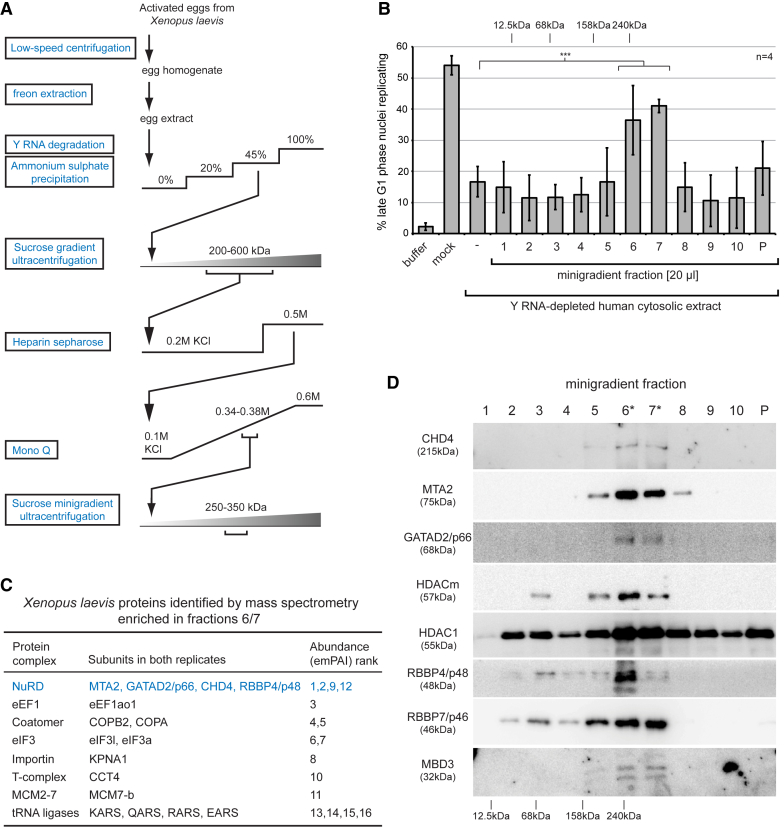 Figure 2. Isolation and Identification of the Y RNA-Independent Initiation Factor from Xenopus Egg Extracts(A) Schematic representation of the fractionation scheme.(B) Activity profile of the sucrose minigradient fractions. Template nuclei were incubated in Y RNA-depleted human cytosolic extract supplemented with the indicated gradient fractions. Percentages of replicating nuclei are shown as mean values ± SD of n = 4 independent fractionation experiments. Brackets indicate results of t tests (unpaired, two-tailed with unequal variance) of experimental samples (fractions 6 and 7) against the control (∗∗∗p ≤ 0.001). Tests of all other fractions against the control were not significant. Sedimentation of calibrator protein complexes (cytochrome c, 12.5 kDa; BSA, 68 kDa; aldolase, 158 kDa; catalase, 240 kDa) are indicated at the top.(C) Proteins in active fractions as identified by mass spectrometry. Proteins identified in both of two independent experimental replicates that were enriched in the active gradient fractions 6/7 compared with inactive fraction 5 are ranked according to their abundance (determined as emPAI scores).(D) NuRD subunit sedimentation profiles. Fractions of the sucrose minigradient were analyzed by western blotting with antibodies specific for the indicated NuRD subunits.See also Figure S1 and Table S1.