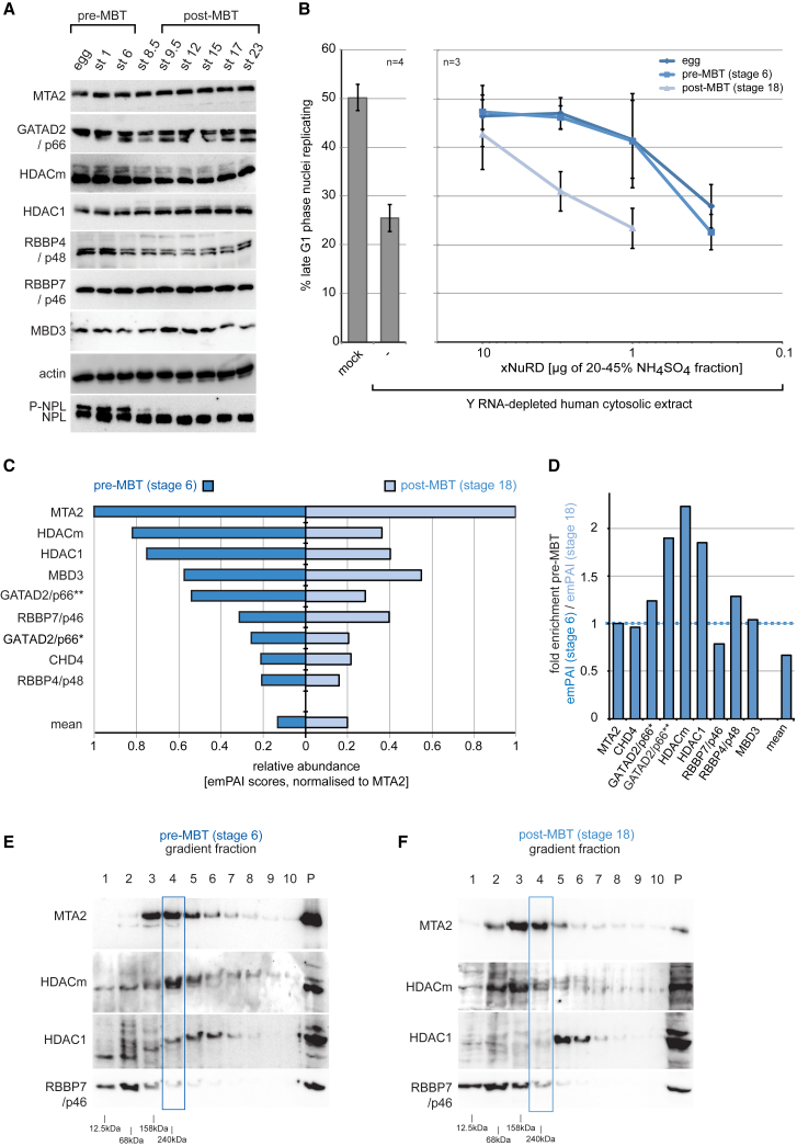 Figure 6. The Replication Initiation Activity and Complex Formation of xNuRD Declines after MBT(A) Expression of xNuRD during development of Xenopus laevis. Extracts of staged embryos were analyzed by western blotting. Pre-MBT and post-MBT stages are indicated. Dephosphorylation of hyperphosphorylated nucleoplasmin (P-NPL) is a control for MBT (stage 8.5).(B) DNA replication initiation activity of xNuRD declines after MBT. Template nuclei were incubated in Y RNA-depleted human cytosolic extract supplemented with partially purified xNuRD from activated eggs, stage 6 pre-MBT embryos, and stage 18 post-MBT embryos, as indicated. Mean values ± SD of the percentages of replicating template nuclei are plotted from n independent experiments.(C) Mass spectrometry analyses of xNuRD complexes. MTA2 was immunoprecipitated from pre-MBT (stage 6) and post-MBT (stage 18) embryo extracts. Xenopus proteins identified in the immunoprecipitates were ranked according to their quantitative emPAI values in the pre-MBT IP after normalization to emPAI (MTA2) = 1. All xNuRD-specific subunits detected are plotted (left, dark blue bars for pre-MBT; right, light blue bars for post-MBT). The mean normalized emPAI values for all detected proteins are indicated. Separate isoforms were identified in the Uniprot database for GATAD2/p66 (∗LOC398154; ∗∗LOC100158394, isoform X2).(D) Relative enrichment of xNuRD subunits before MBT in immunoprecipitated complexes. Normalized emPAI values were taken from MTA2 co-immunoprecipitations of stage 6 pre-MBT and stage 18 post-MBT extracts, and their ratios are plotted for the indicated xNuRD subunits and the overall mean.(E and F) xNuRD complex formation in (E) pre-MBT and (F) post-MBT embryo extracts. xNuRD was partially sub-fractionated by precipitation with 20%–45% ammonium sulfate and ultracentrifugation through preparative sucrose gradients. MTA2, HDAC, and RBBP7 subunits were analyzed by western blot analysis of the preparative sucrose gradient fractions. A blue box shows the reference for the sedimentation of active xNuRD from egg extracts. Positions of sedimentation markers are indicated.See also Figure S4 and Table S4.