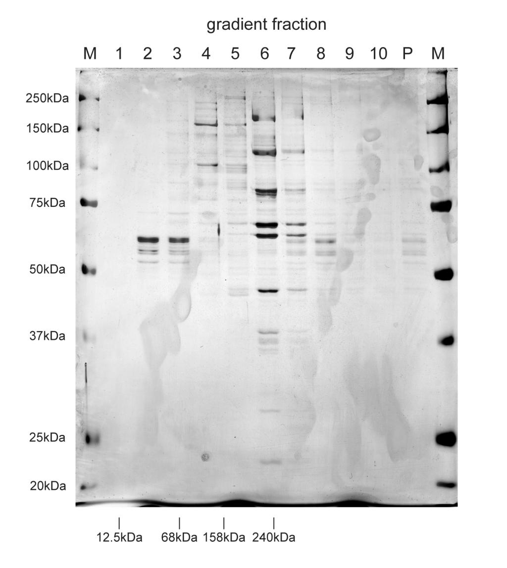 Fraction numbers (1-10, collected from top to bottom of the gradient), pellet (P) and molecular weight