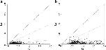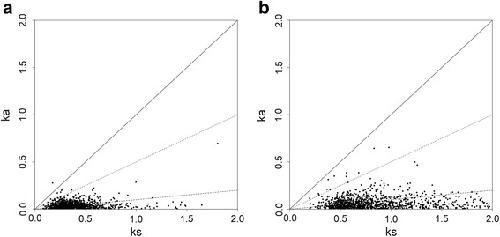 Fig. 2. Ka/Ks ratio of 1244 single-copy orthologous genes. a. Ka/Ks distribution in Andrias davidianus and Hynobius chinensis, b. Ka/Ks distribution in Andrias davidianus and Notophthalmus viridescens. The solid line shows the threshold of Ka/Ks = 1, the dashed line marked the weak positive selection threshold of Ka/Ks = 0.5, and the short dashed line represented threshold of Ka/Ks = 0.1