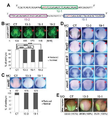 and MO (1.5 ng each), cultured to stageâ¼12.5, and processed for in situ hybridization for snail2. Only the injected side is shown, with anterior at the top and dorsal to