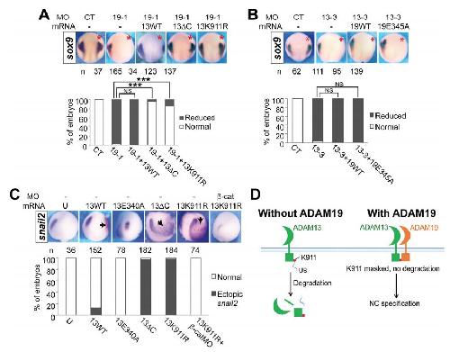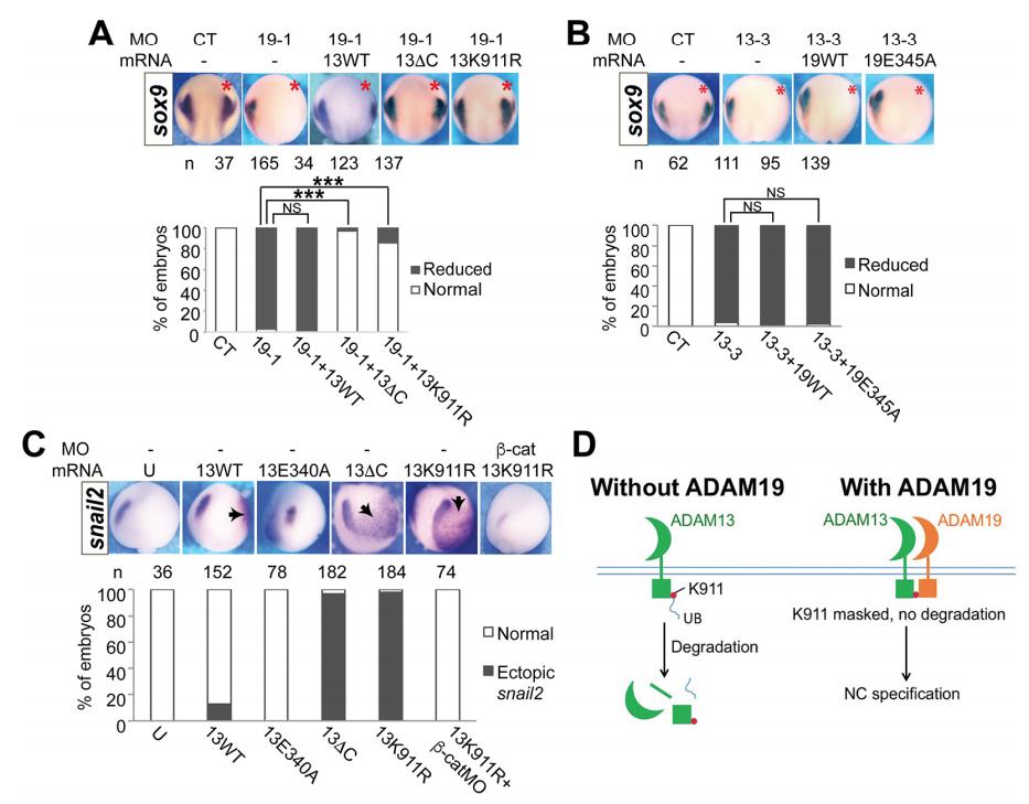 the left. Arrows indicate the ectopic snail2 expression. (D) A model for the regulation of ADAM13 stability and NC specification by ADAM19. Crescents indicate