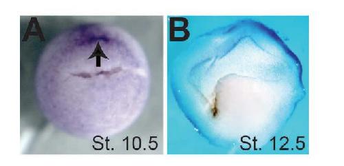 view with dorsal at the top. Arrow denotes the dorsal blastopore lip. B. A bisected embryo