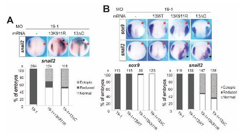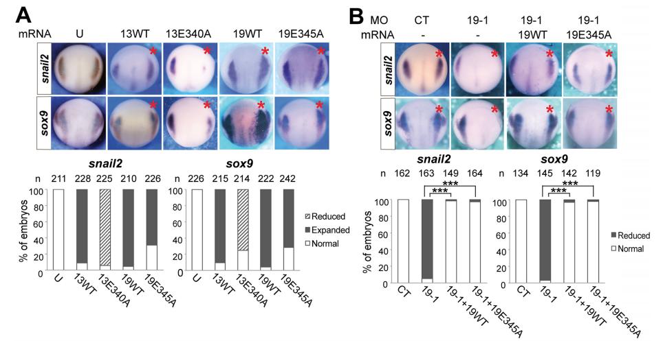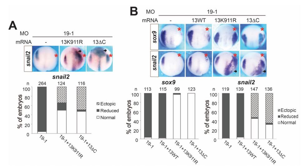 Fig. 6. The stabilized ADAM13 mutants can rescue the NC specification defects caused by ADAM19 knockdown and induce ectopic snail2 in the ventral