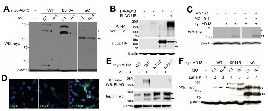 ubiquitin with and without HA-tagged ADAM13 (B), or myc6-tagged wild-type ADAM13 or the K911R mutant (E). Immunoprecipitation and western blot were