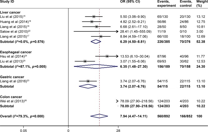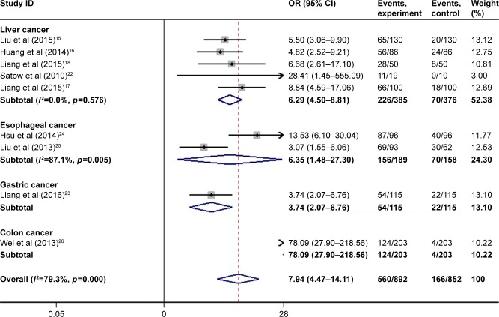 Figure 2. Meta-analysis of aberrant overexpression of TPX2 in digestive system cancers.Note: Weights are from random-effects analysis.Abbreviations: TPX2, Xenopus kinesin-like protein 2; OR, odds ratios; CI, confidence interval.