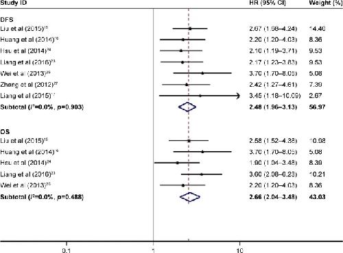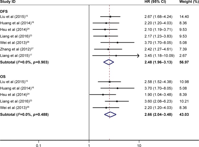 Figure 3. Meta-analysis of the pooled HRs of patients with elevated TPX2 expression.Note: Weights are from random-effects analysis.Abbreviations: TPX2, Xenopus kinesin-like protein 2; HR, hazard ratio; CI, confidence interval; DFS, disease-free survival; OS, overall survival.