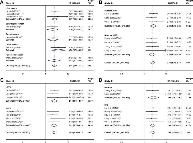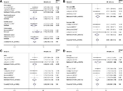 Figure 4. Subgroup analyses were performed by the factors of cancer type (A), sample size (B), quality score (C), and laboratory detection method (D).Note: Weights are from random-effects analysis.Abbreviations: HR, hazard ratio; CI, confidence interval.