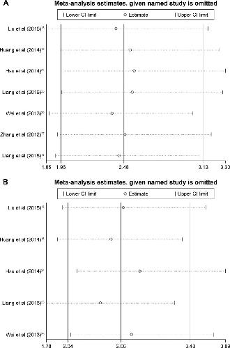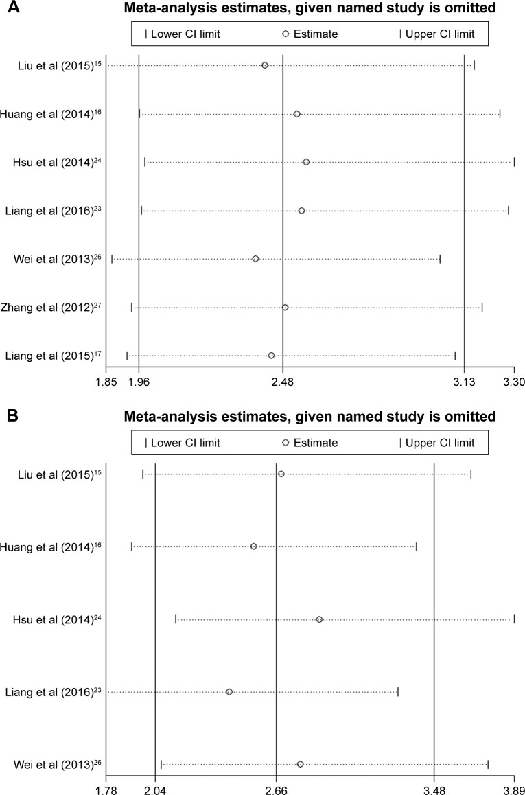 Figure 5. Sensitivity analysis of the effect of the individual study on the pooled HRs for the correlation between TPX2 and disease-free survival (A) and overall survival (B) in patients with digestive system cancer.Abbreviations: TPX2, Xenopus kinesin-like protein 2; HR, hazard ratio; CI, confidence interval.
