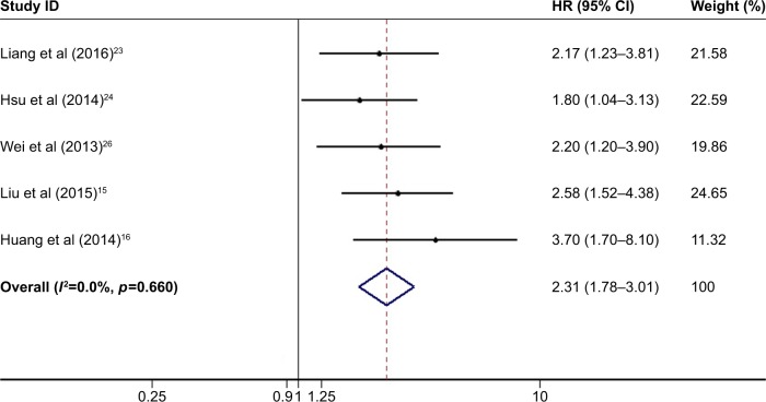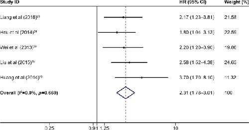 Figure 6. Meta-analysis of the independent role of TPX2 in overall survival of cancer patients.Note: Weights are from random-effects analysis.Abbreviations: TPX2, Xenopus kinesin-like protein 2; HR, hazard ratio; CI, confidence interval.