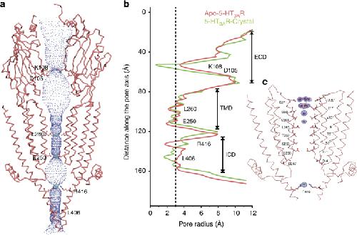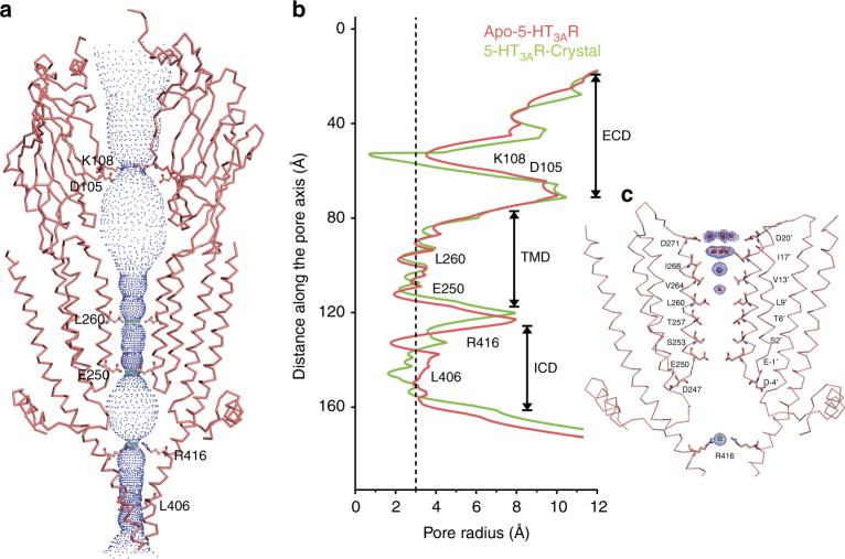 Fig. 3. Profile of ion permeation pathway. a The pore profile generated by the HOLE program60 depicts an ion permeation pathway of ~165âà encompassing the ECD, TMD, and the ICD. Only two subunits are shown for clarity. Sidechains of residues that line the constricted areas are shown as sticks. b A comparison of the pore radii along the pore axis for the 5-HT3AR cryo-EM structure (salmon red) with that of the crystal structure (pale green). The dashed line indicates an approximate radius of a hydrated Na+ ion35. The pore is constricted below 3âà radius at three sites: L260 and E250 along M2 and R416 in the ICD. c Non-protein densities along the pore axis were modeled as water (red), Na+ (magenta), and Clâ (green). The map around the ions is shown as a mesh representation calculated at various Ï values (outer water ring: 4 Ï; inner water ring:5 Ï; Na+ ion: 6 Ï; Clâ ion: 7 Ï)