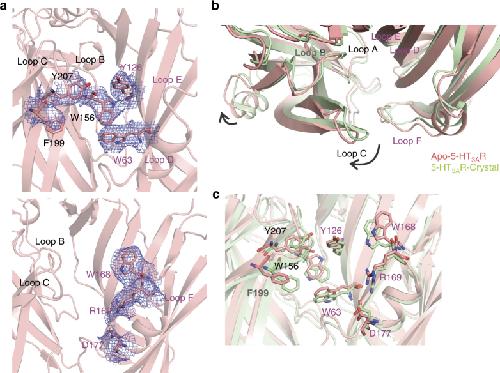 Fig. 4. The neurotransmitter binding site. a The map around the aromatic residues at the subunit interface that constitutes the neurotransmitter binding site (top). The map for the residues in Loop F that are involved in ligand binding (bottom). b Alignment of 5-HT3AR apo (salmon red) and crystal (pale green) structures reveals a twist and an expansion at the region lined Loop C, Loop B, and Loop F. The arrows indicate the direction of movement. c A comparison of the orientations of the residues that are involved in neurotransmitter binding