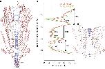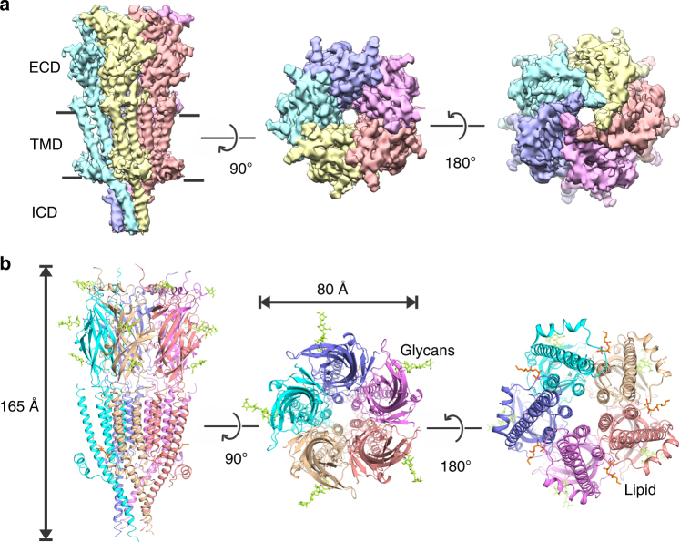 Fig. 1. Cryo-EM structure of apo-5-HT3AR. a The 3D reconstruction map from the full-length 5-HT3AR at 4.3âà resolution. The views, going from left to right, are parallel to the membrane (side view), from the extracellular side (top view), and from the intracellular side (bottom view). Individual subunits are depicted in different colors, and the three domains are labeled. The solid lines denote putative membrane limits. b Cartoon representations of the 5-HT3AR structural model based on the EM reconstruction. The views correspond to the orientations shown in a. For each subunit, three sets of glycans (green) and one lipid (brown) molecule are shown as stick representation