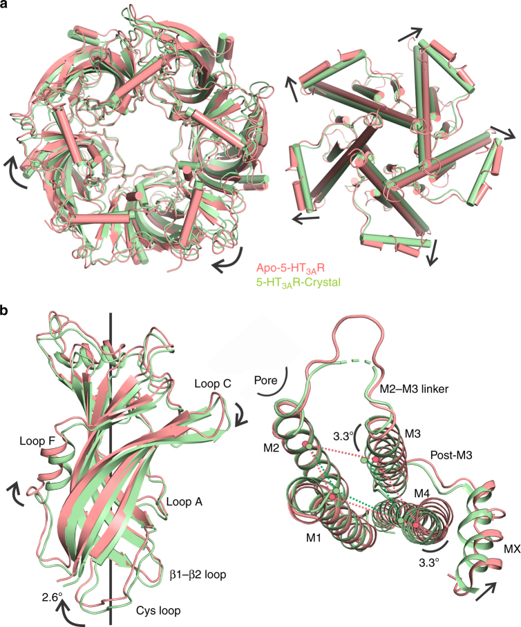 Fig. 2. Alignment of the apo-5-HT3AR with the crystal structure of nanobody-bound 5-HT3AR. a A view of the ECDs from the extracellular end when aligned with respect to the TMDs (left). The view of the TMDs from the intracellular end when aligned with respect to the ECDs (right). The apo-5-HT3AR structure and the 5-HT3AR crystal structure are shown in salmon red and pale green, respectively. The arrows show the putative direction of displacements between the two structures. b A comparison of the ECD of the apo-structure with the crystal structure when aligned with respect to the TMD of the (â) subunit (left). A comparison of the TMD between the two structures when aligned with the ECD of the (â) subunit. The relative tilt of the axis parallel to the TM helices between the two structures are indicated. The dotted lines highlight the differences in the intrasubunit cavity volume. The spheres indicate the position of residues M1 (Leu227), M2 (Leu266), M3 (Met291), and M4 (Trp456). The arrows show the putative direction of displacements between the two structures (right). The alignment in b highlights the relative changes in the two structures, both with respect to the neighboring subunit, as well as with respect to the other domain