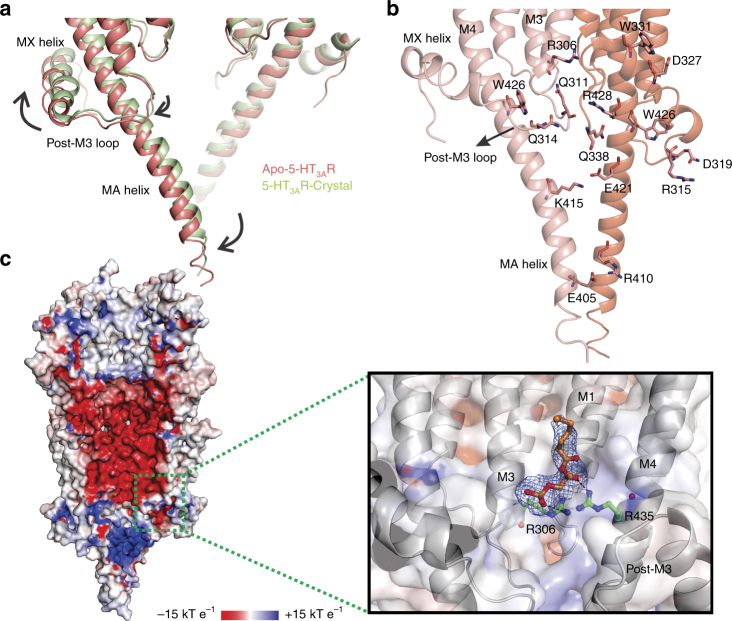 Fig. 5. The Intracellular domain. a The ICD is comprised of the post-M3 loop, the MX, helix, a stretch of unstructured region, followed by the MA helix. The density from the MX helix is bent downward to the intracellular end of the MA helix, but the unstructured region is not resolved. Superposition of the 5-HT3AR apo and crystal structures reveals differences in the conformation of ICD in the two structures. The (â) subunit of the two structures are aligned. The expansion of the ICD resulting from an outward displacement of MA and MX helices are indicated by arrows. b The residues within the ICD involved in several potential intra and inter-subunit interactions. c The solvent-accessible electrostatic potential map generated using the APBS tool. The inset shows a zoomed-in view of the lipid-binding pocket within the dotted green box. The lipid (partially built phospholipid) and the interacting residues (R306 and R435) are shown in stick. The map around the lipid is shown as blue mesh